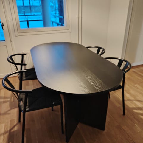 Erittäin hyvässä kunnossa oleva -20 ostettu neljän hengen musta tamminen ruokailuryhmä. Laadukkaat Pohjanmaan Kalusteen tuotteet.