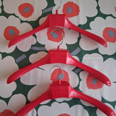 Myydään Sarviksen Majuri henkareita. Kaikki ehjiä, ei lohkeamia. Harmaat pehmeämpää muovia, turkoosi, vihreä ja lila kovempaa. Kts. lähikuva harmaiden teksteistä.