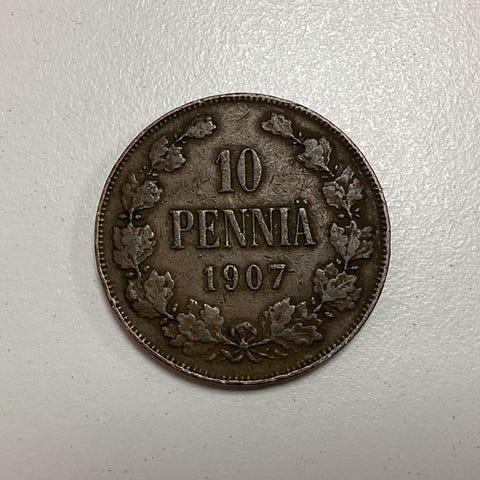 Kuparista valmistetut 10 pennin rahat lyötiin Suuriruhtinaskunnan aikaan vuosina 1865–1917.