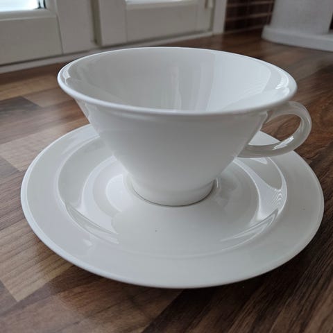 Arabia lautanen, valmistettu keraamisesta materiaalista. Lautanen on valkoinen, yksinkertaisella ja hillityllä reunakoristeella.