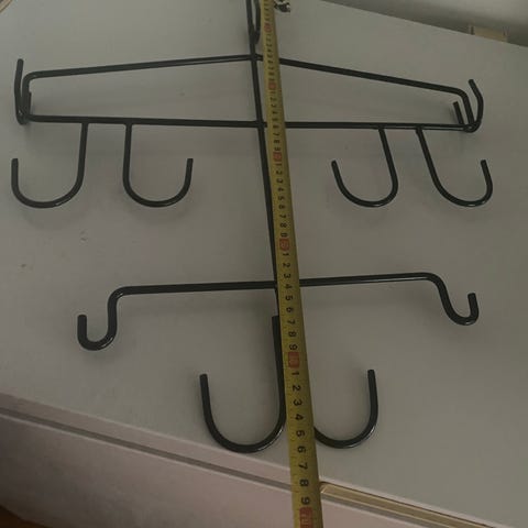 Metallinen vaateripustin, jossa on useita koukkuja varusteiden ripustaniseen