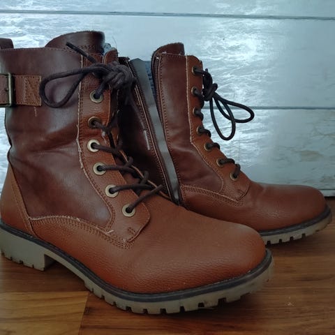 Kivat, vaaleat talvikengät, joita on käytetty muutaman kerran. Ostettu viime vuoden maaliskuussa. Katso pieni tummentuma reunassa, ei ole yritetty poistaa. Koko 41, mutta malli ei sopinut jalkaani. Keinomateriaalia, ei nahkaa.