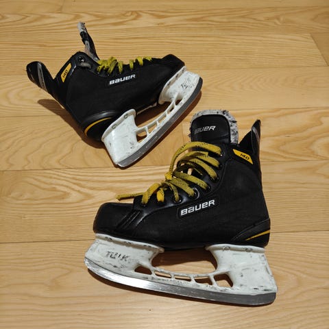 Kahdella lapsella pääsääntöisesti koululuistelussa käytössä ollut hyväkuntoiset luistimet.