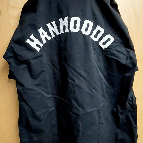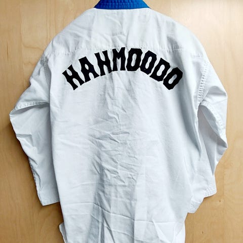 Musta 180 cm Han Moo Do -puku laadukkaalla kankaalla. Takin selässä teksti Hanmoodo.