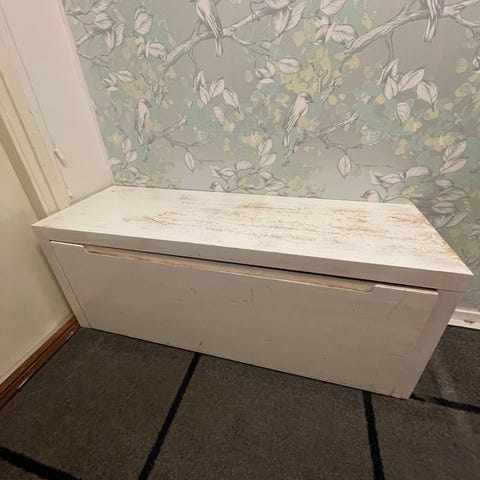 Myydään puinen penkki jossa korit sekä päällä istuinpehmuste. Koreissa kangaspussit joista yhdestä narut irronneet. On maalin kulumaa ja pinttynyttä likaa, kankaat heitän vielä pesuun. Istuinpäällisen toisella puolella on mustaa akryylimaalia tms joka ei pesussa lähde.