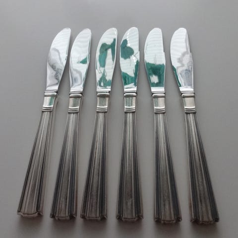 Lusikat ja haarukat ovat täyshopeaa. Veitsessä hopeinen kahva (916), terä terästä.