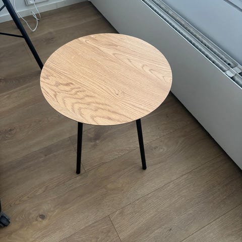 Myydään Jyskin musta yöpöytä / sivupöytä. Pöydän halkaisija on 25 cm ja korkeus 60 cm. Tasossa joitakin haaleita jälkiä pöydän päällä pidetyistä esineistä.