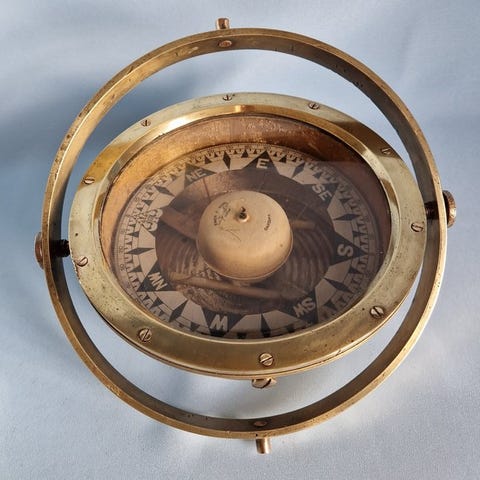 Vanha kompassi roikkuu karthanoidisessa renkaassa, jonka halkaisija on 24 cm. Kompassin halkaisija on 18 cm. Valmistaja on hollantilainen yritys Lans Rotterdamista.