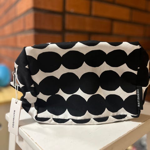 Uudenveroinen Marimekko - kosmetiikkalaukku, väri musta. Sisällä molemmilla puolella isompi tasku sekä toisella reunalla joustokuminauhalla oleva paikoitus kosmetiikkatuotteille.