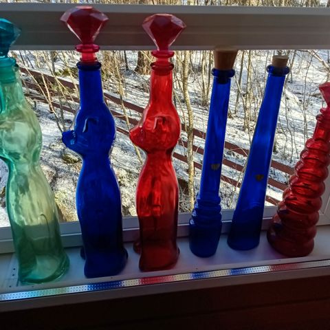 Kissa koriste pullot värillinen lasi. Pullo on valmistettu lasista ja siinä on erivärisiä, kissa pulloja. Sopii sisustukseen, maljakoiksi ym. Kaikki 12 kappaletta yhteensä 85€. Pullon korkeus noin 34cm.