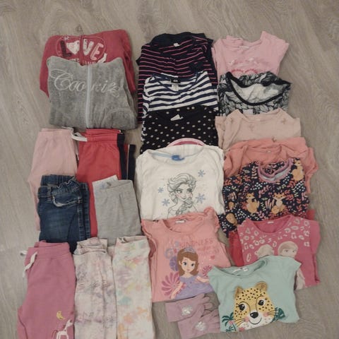 Vaatteet enimmäkseen kokoa 98-104, jotain pienempää ja isompaa voi myös olla. Kunto vaihtelee, monet paljon käytettyjä ja pikkuvikaisia. Hajusteeton pesu, ei lemmikkejä.