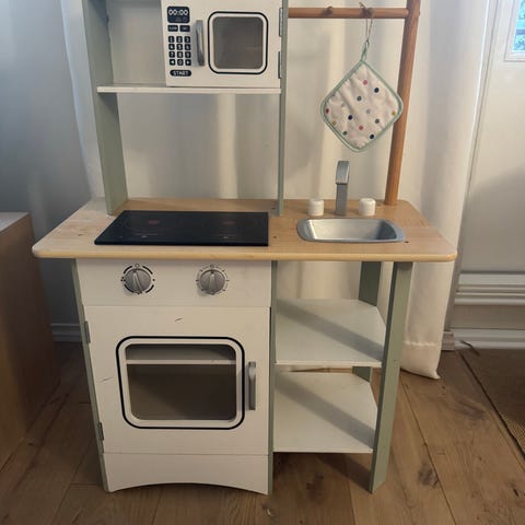 lasten leikkikeittiö harmaa ja valkoinen väri. Leikkikeittiössä on jääkaappi, uuni, liesi ja työtaso. Tuotteessa näkyy käytönjälkiä
