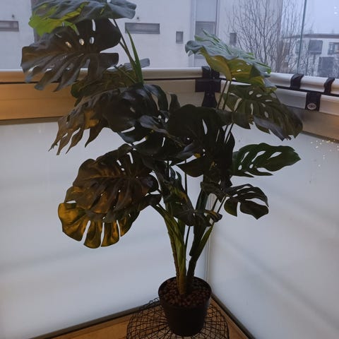Iso ja elinvoimainen peikonlehti. Hyväkuntoiset ilmajuuret. Korkeus noin 130 cm. Tuettu juuttinarulla puu-/kookostukikeppiin.