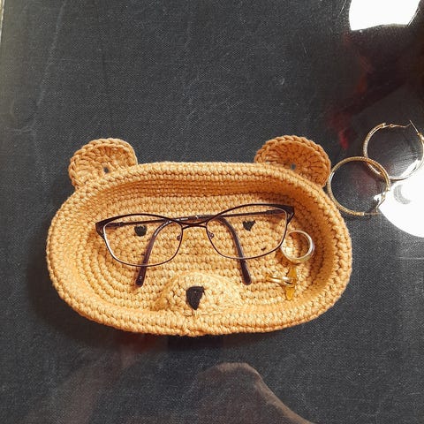 Käsinvirkattu silmälasikori.