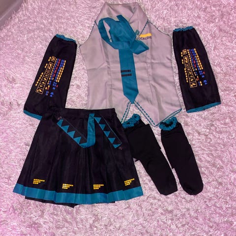 Kuvan S-koon asu. Mukaan tulee paita, solmio, hame, sukat sekä 2 paria irrallisia hihoja.