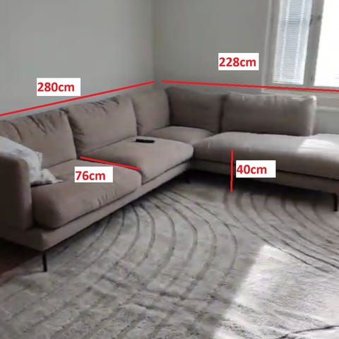 Hyväkuntoinen, erillisistä muunneltavissa olevista elementeistä koottu avokulmasohva.