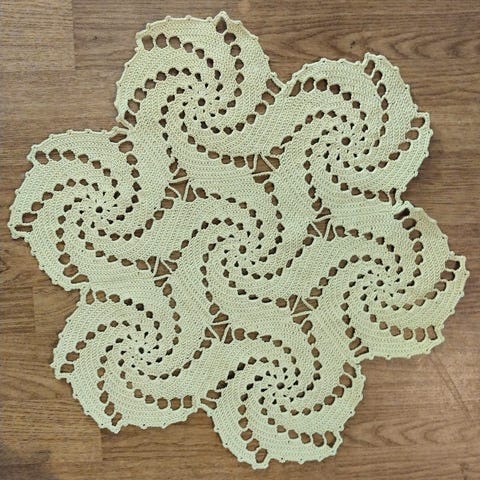Neljä (4) pientä käsinvirkattua (pöytä)liinaa, koot 15-20cm, hp 20€