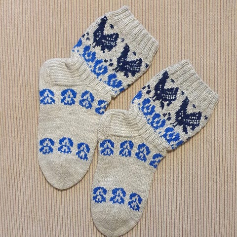 Käsin neulotut uudet villasukat, uros metso kuviolla. Lanka Novita 7 veljestä, 80 % villaa, 20 % polyamidia, vahvistettu kantapää. Pesu 40 asteessa, kestää konepesun. Sukan varren pituus kantapäästä on 25 cm ja terän pituus kantapäästä kärkeen 29 cm.