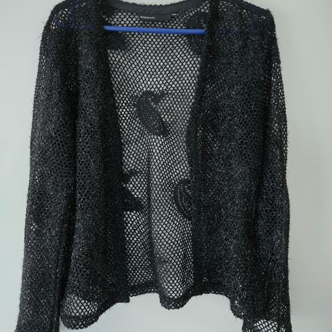 Kappahl Friday neuletakki musta, jossa kukkakirjailu koristelua. Neuleen materiaali on 100 % puuvillaa ja koko on 38/40. Neuletakissa on napitus 6 nappia.
