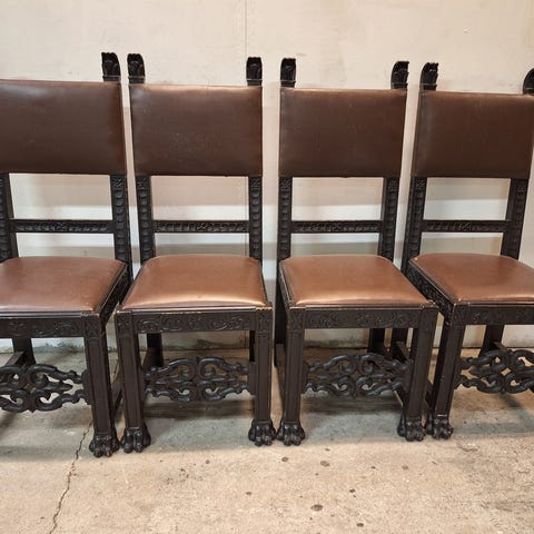 Kaksi jykevää antiikkituolia. Pöytä ja neljä pienempää tuolia omissa ilmoituksissaan.
