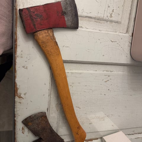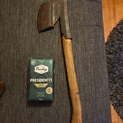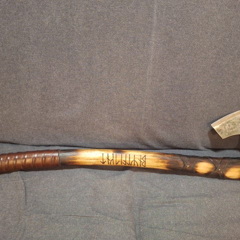 Kuvan mukainen viikinkimallinen kirves ja kahvassa on koristeellinen nahasta tehty punoskuvio.