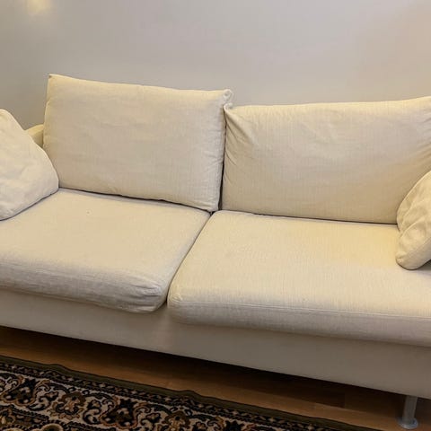 Vaalea sohva, jossa on puurunko. Sohvassa näkyy kankaassa käytön jälkiä mutta kangas irtoaa ja on pestävä. Pohjassa suojakangas on hapertunut mutta ei vaikuta käyttöön millään tavalla. Vain nouto jätkäsaaresta.
