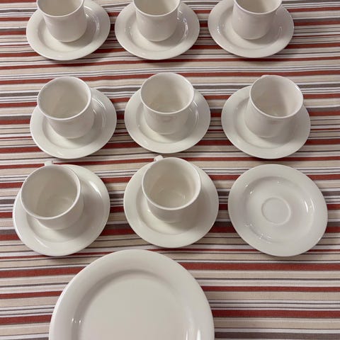 Valkoiset Arabia Arctica Troikka kahvikupit ja lautaset. Sarja soveltuu astianpesukoneeseen, mikroaaltouuniin ja uuniin. Materiaali kestävä posliini. Aluslautasia 6kpl, kuppeja valitettavasti vain 5kpl (huomioitu hinnassa).
