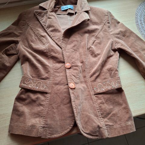 Tummanpunainen / violetti jakku, jossa mokkamaisen tuntoinen pinta. Kankaassa tummemmalla kashmirkuviointia. Metallinen vetoketju ja pienet taskut pystysaumoissa.