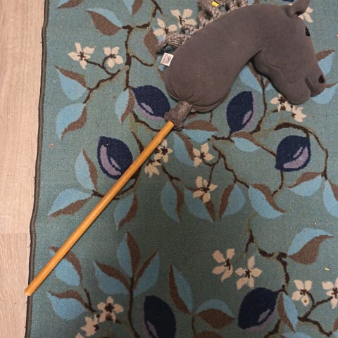 Erilaisia leluja ja pelejä. Nukke ja nuken vaatteita. Keppihevosia ja niille tarvikkeita.