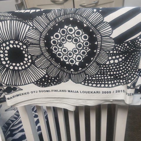 Myydään Marimekon Karkuteillä kangas. Kangasta yhden raportin verran. Alhaalle ja ylhäälle on ripustettu verhotangot ja on meillä ollut hetken makuuhuoneen seinällä.