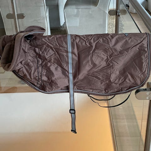 Siistissä kunnolla oleva rukan fleece koiran vaate tarrakiinnityksellä. Helppo pukea. Selän pituus noin 33cm ilman kaulusta.