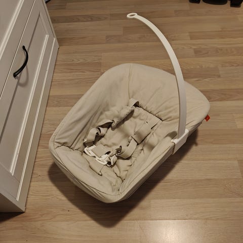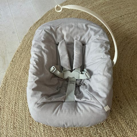 Stokke Tripp Trapp Newborn Set vauvanistuin harmaalla pehmeällä päällisellä. Sopii vastasyntyneille, kiinnittyy Tripp Trapp -syöttötuoliin. Varustettu turvavaljailla.