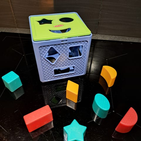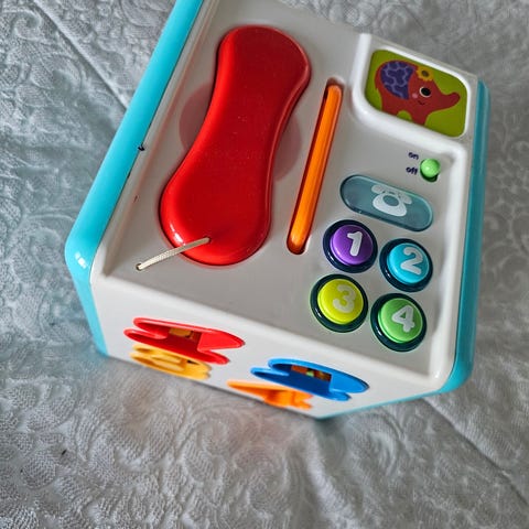 Erilaisia muotoja, pohjassa kellotaulu, jonka avulla laatikon saa myös kokonaan auki. Puhelin äänillä. Toimiva.