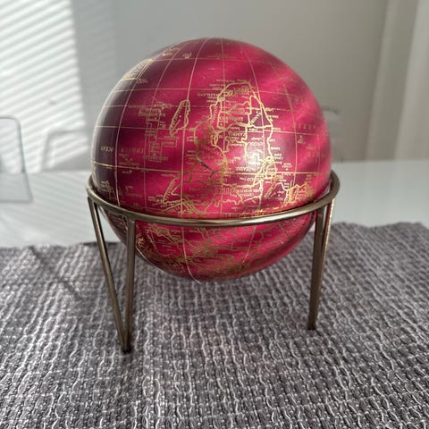 Kaunis todella vanha karttapallo koristeeksi. Pallossa on hieno kohokuviointi pinnassa ja kauniit sävyt. Se seisoo vielä tukevasti puu/metallitelineessään, mutta sen paperipinta on yhdestä kohtaa isommin revennyt ja pallon keskiosassa on vaakana iso halkeama. En ole yrittänyt liimata ja korjata. Pallo sopii vanhaa arvostavaan kotiin koristeeksi vaikka onkin jo kärsinyt.