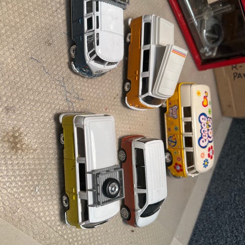 Volkswagen Transporter T1 Samba. Hyväkuntoinen pienoismalli/leikkiauto. Kulkee eteenpäin kun vetää ensin vauhtia taaksepäin. Takaluukku aukeaa.