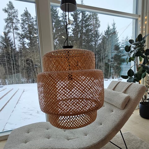 Myydään tarpeettomaksi jäänyt wabi-sabi tyylinen bambuvalaisin. Valaisimeen lisätty pistotulppa kytkemiseksi.