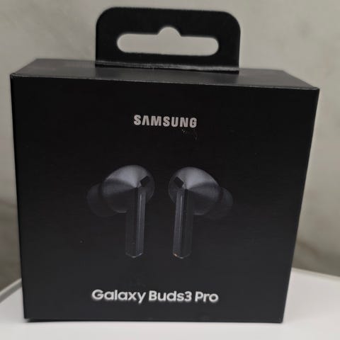 Viime tammikuussa ostetut Samsungin Buds3 Pro kuulokkeet. Takuuta reilu vuosi jäljellä, Elisan kuitti mukaan. Myynnissä myös puhelimen Galaxy S25 mukana.