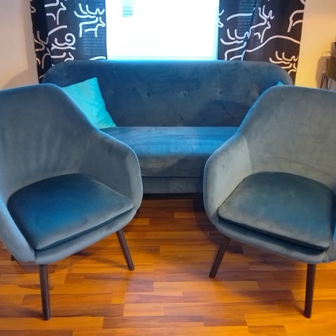 Biedermyer. Sohva, tuoleja 3 kpl. Ja pöytiä 2 kpl.