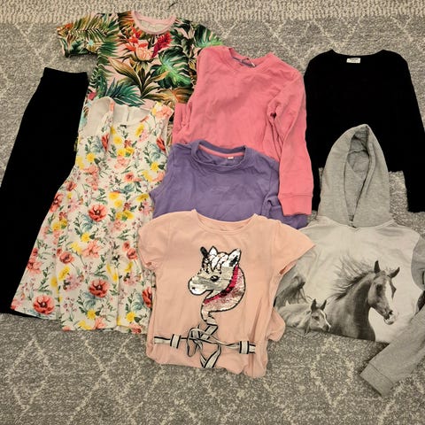 H&M college kokolapussa lukee 146/150, mutta vastaa ennemmin kokoa 134/140cm. Tässä hihassa tahroja (kuvat) jotla ei ole lähtenyt normi pesussa pois. Muuten ehjä.