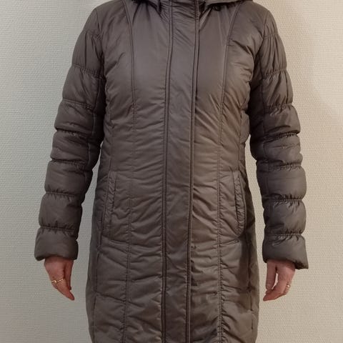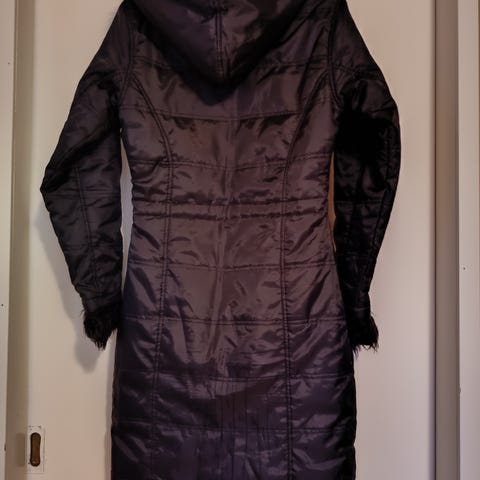 Musta pitkä takki naisille, koko 36. Takissa on puolipitkä malli. Huppu.