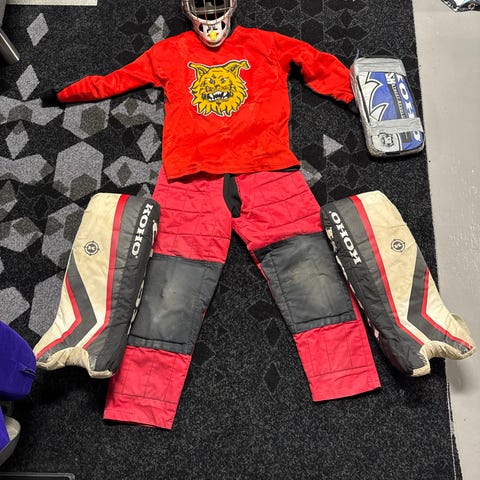 Käytetyt maalivahdin varusteet ihan kohtalaisessa kunnossa, löytyy käytön jälkiä.