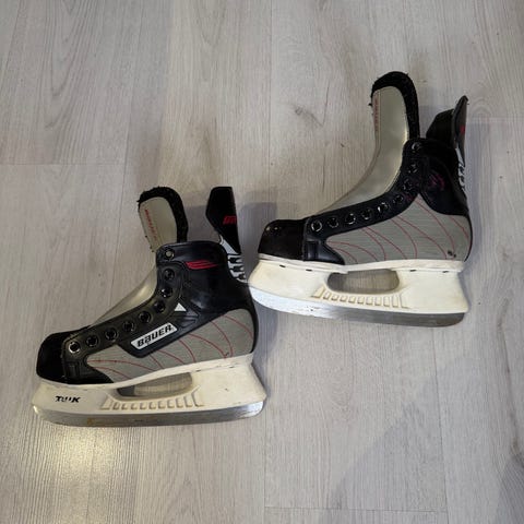 Bauer Vapor jääkiekkoluistimet koossa 36. Luistimissa on musta, valkoinen ja punainen väritys. Sopivat jääkiekon harrastamiseen.