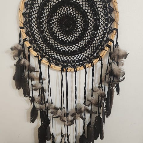 Kaunis vaalean ruskean nahan maan sävyjä huokuva unisieppari sulkakoristein. Korkeus 50 cm.