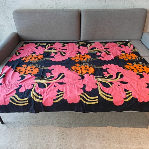Värikäs kangas, jossa on oranssin, vihreän ja mustan sävyjä sisältävä kuviointi. Kangas näyttäisi olleen verhona. KOko 140 lev * 163 pit. Iso kääntövara 7cm. Siistissä kunnossa ja värit ovat säilyneet todella hyvin!