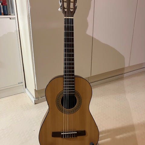 Nylonkielinen akustinen kitara. Sopii hyvin aloittelijalle. Helppo soittaa ja kaunis ääni.