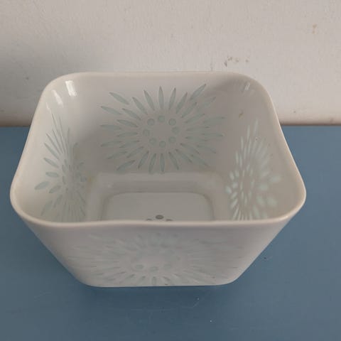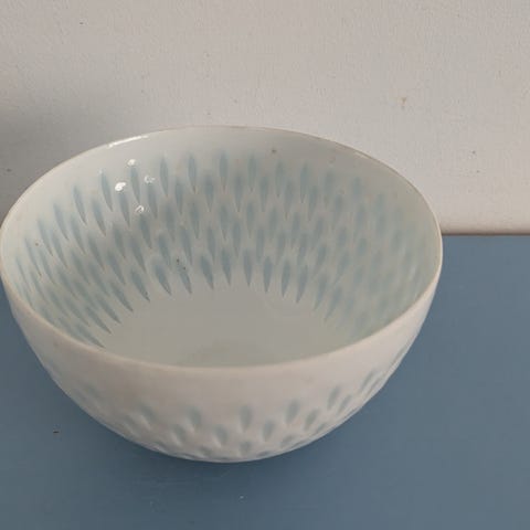 Friedl Holzer-Kjellbergin riisiposliinisia FK-mallin astioita tehtiin usealla eri kuviomallilla. Tämä on mallia Oksa.