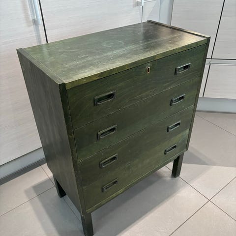 Hyväkuntoinen lipasto. Muutama pieni pintakuluma päällyslevyn reunoilla.