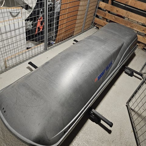 Lukittava boxi sekä telineet. Katto telineet säädettävät joten sopii autoihin joissa kaide kiinnitys. (Ollu V50 Volvos)