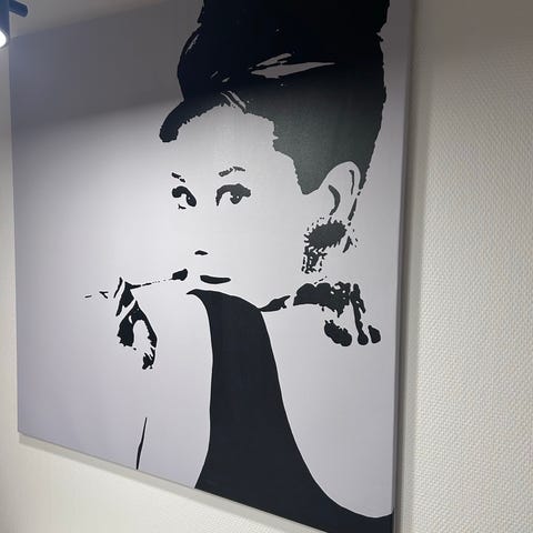 IKEA Audrey Hepburn -taulu mustavalkoisella kuvituksella. Sisustuselementti, joka esittää Audrey Hepburnia tyylitellyllä tavalla.