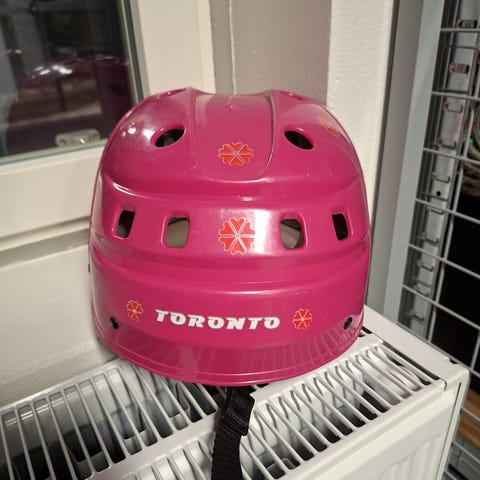 Myyntiin vanha, mutta edelleen vallan toimiva jääkiekkokypärä. Merkin CCM ja kypärässä kokomerkintä M. Menee suunnilleen ala-asteen alaluokilla.